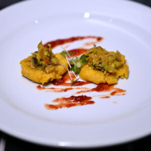 Pressed Green Plantain topped with a Curry Cilantro Saltfish drizzled with Rosemary ...