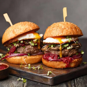 Salmon Burger topped with Caramelized Onions Provolone Cheese served with Fries...